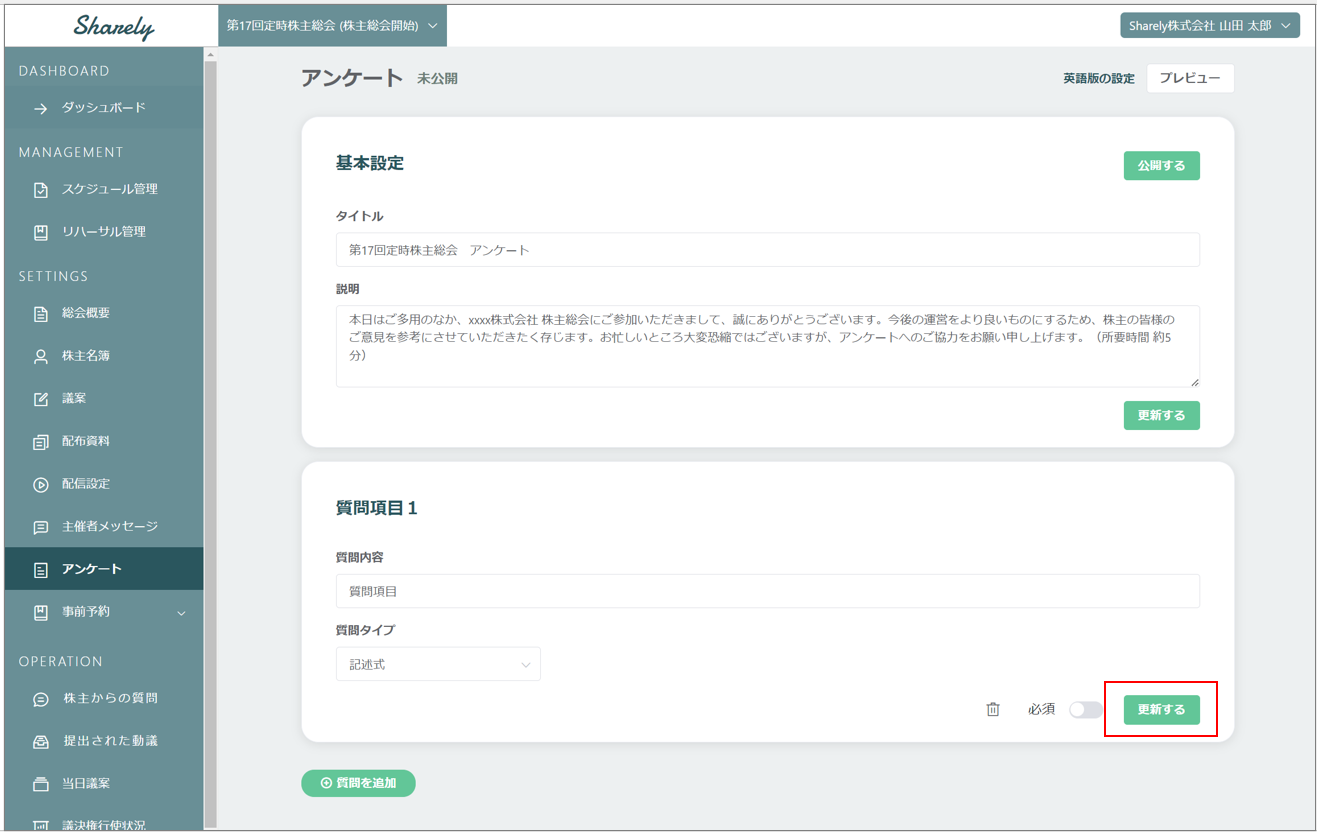 「質問内容」を入力、「質問タイプ」 を選択し、「更新する」をクリックしてください。
