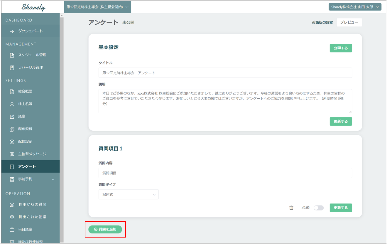 自動で、質問内容・質問タイプがデフォルトで登録された状態で追加されます。2、を参考に質問内容・質問タイプを修正してください。