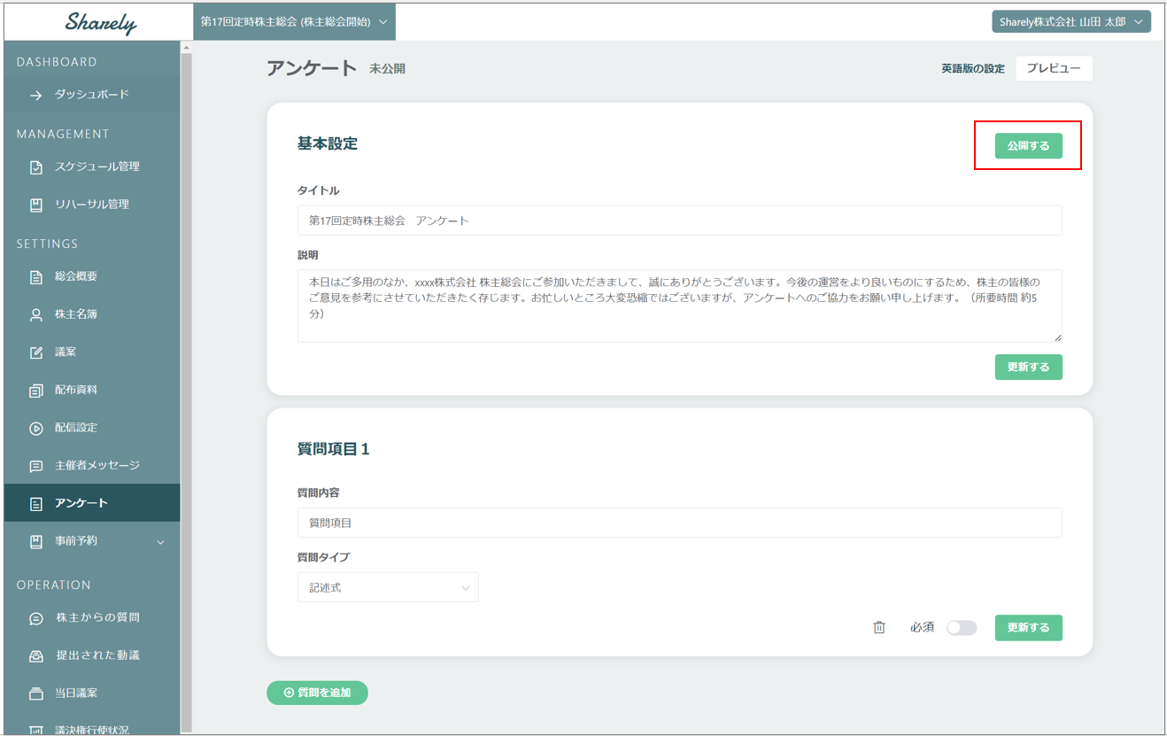 設定が完了したら、アンケートを公開するために、「公開する」をクリックしてください。