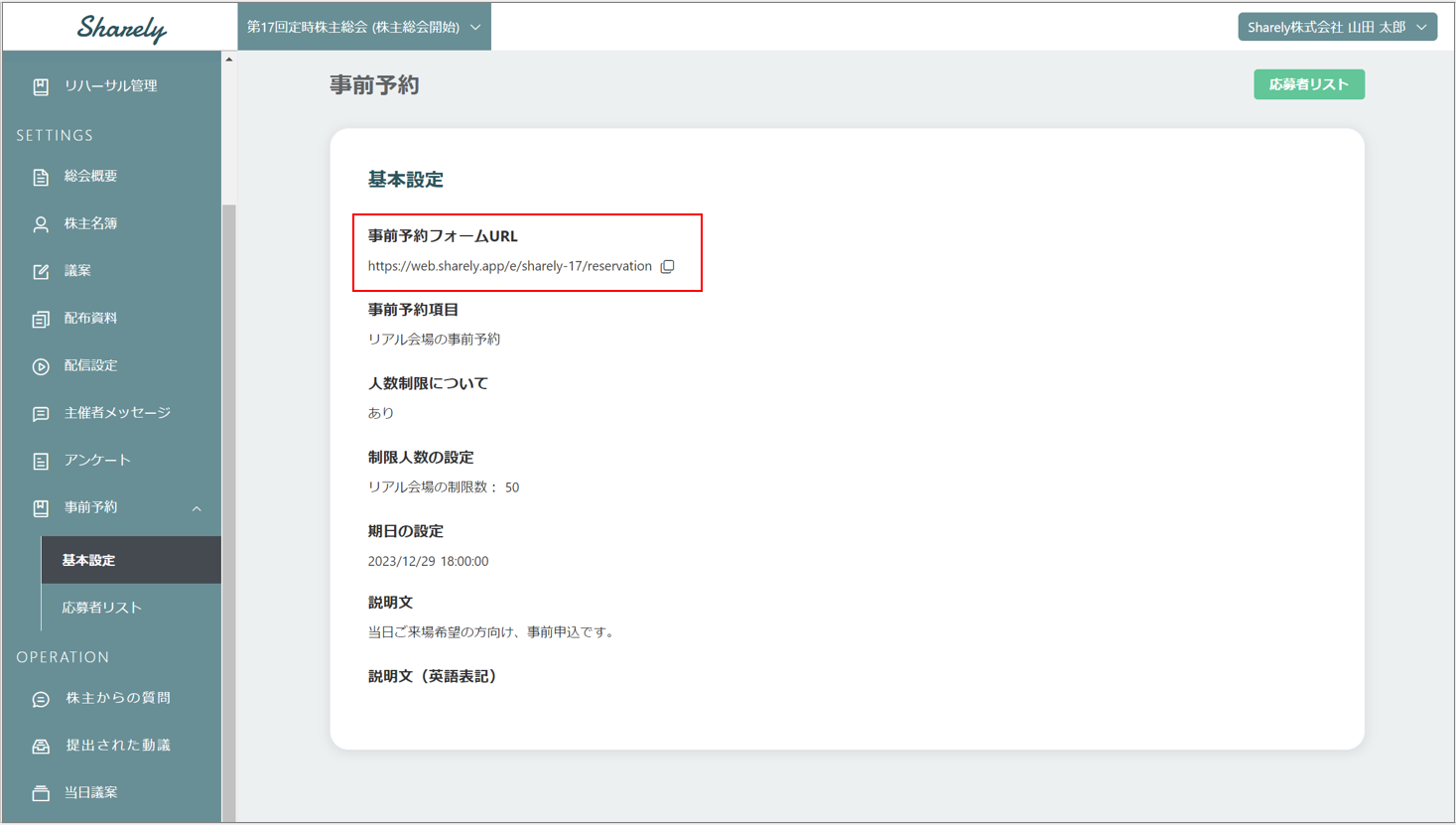 公開ステータスに切り替わると事前予約フォームのURLが発行されます